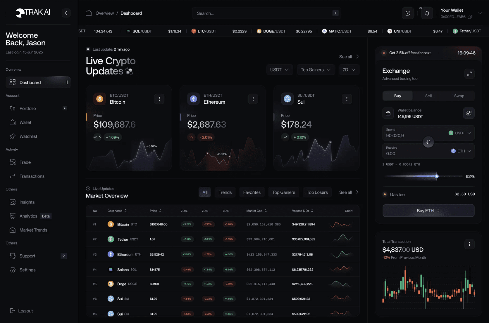 TRAK AI analyzes on-chain activity, market behavior, and sentiment to deliver clear, data-driven crypto insights.